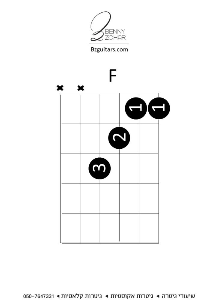 את אקורד F נחזיק כשאצבע ראשונה שוכבת על המיתרים ראשון ושני בשריג הראשון
