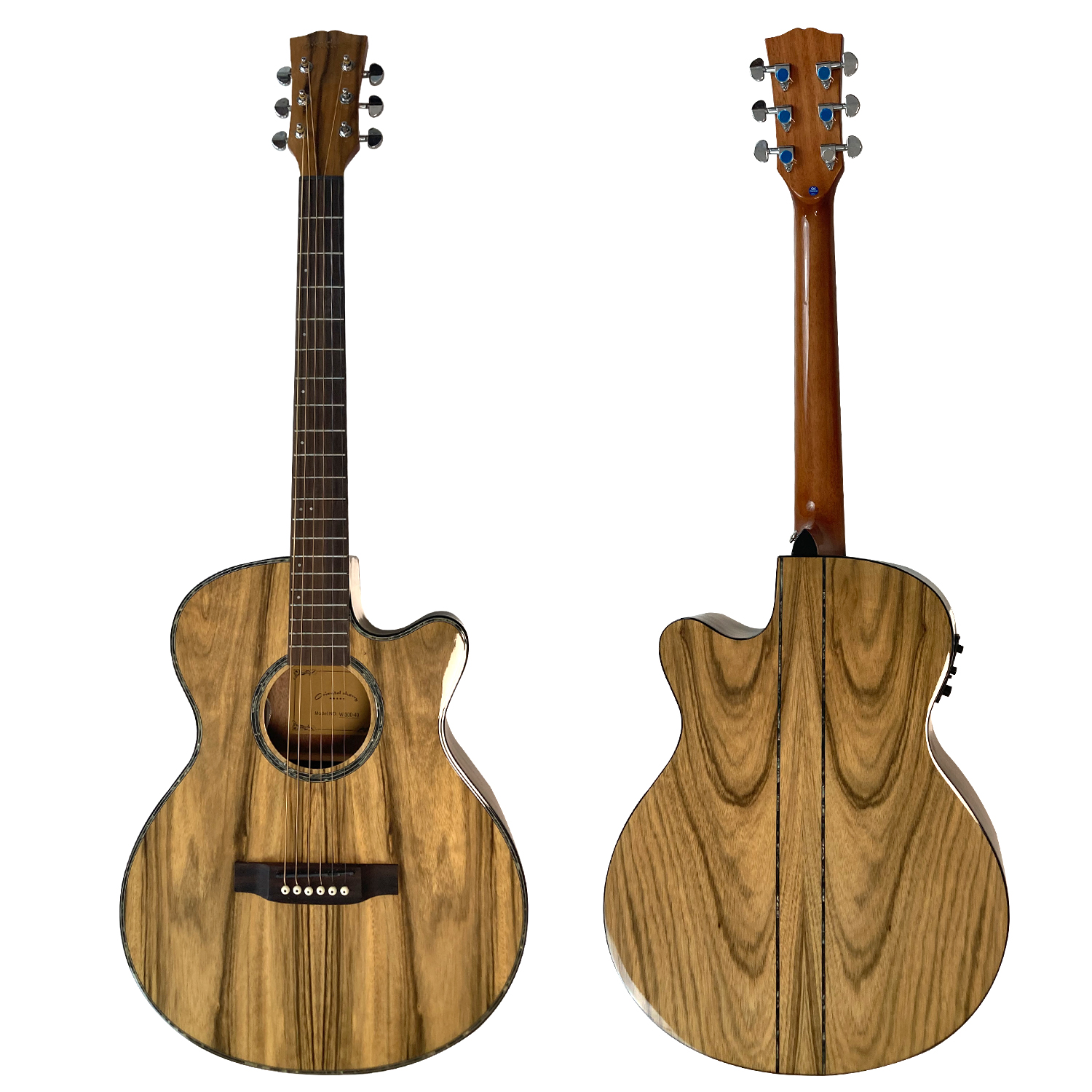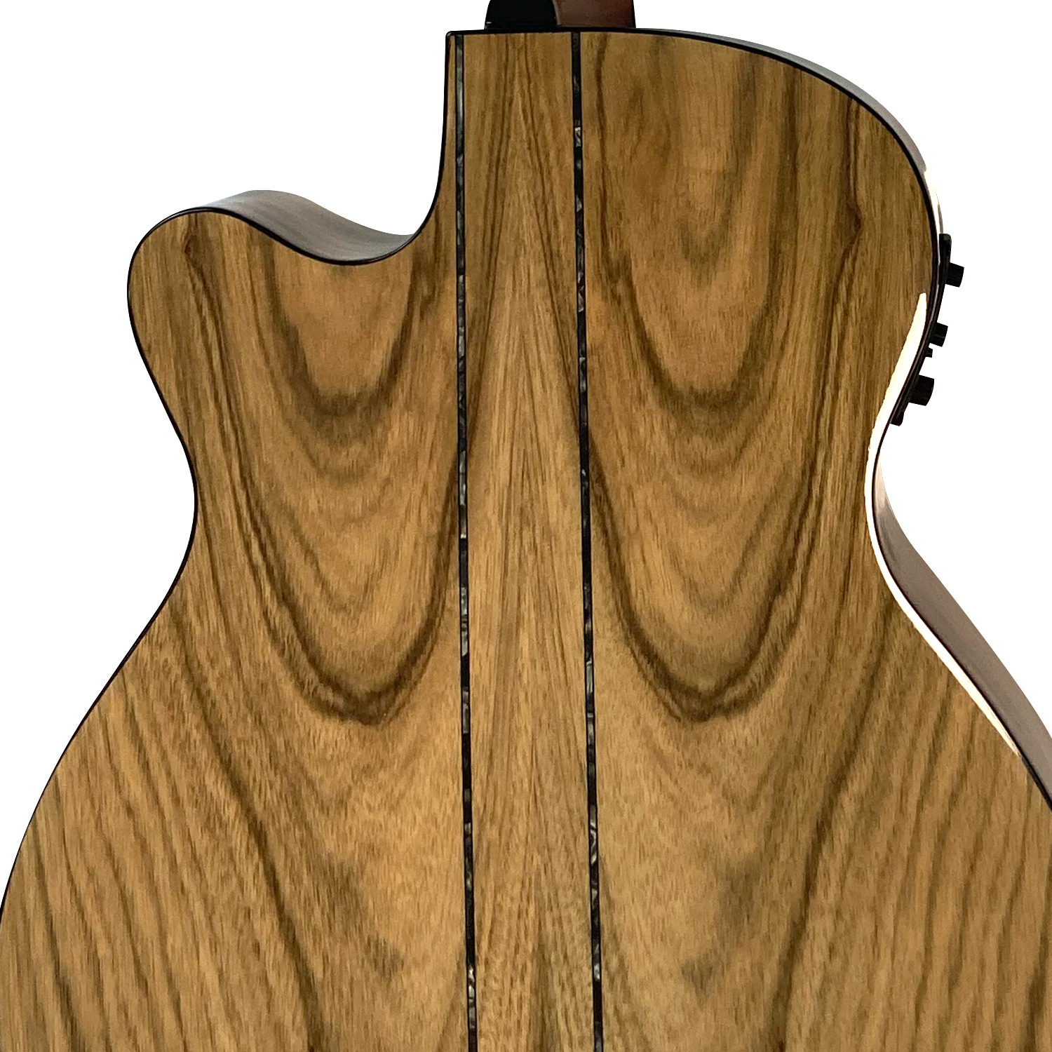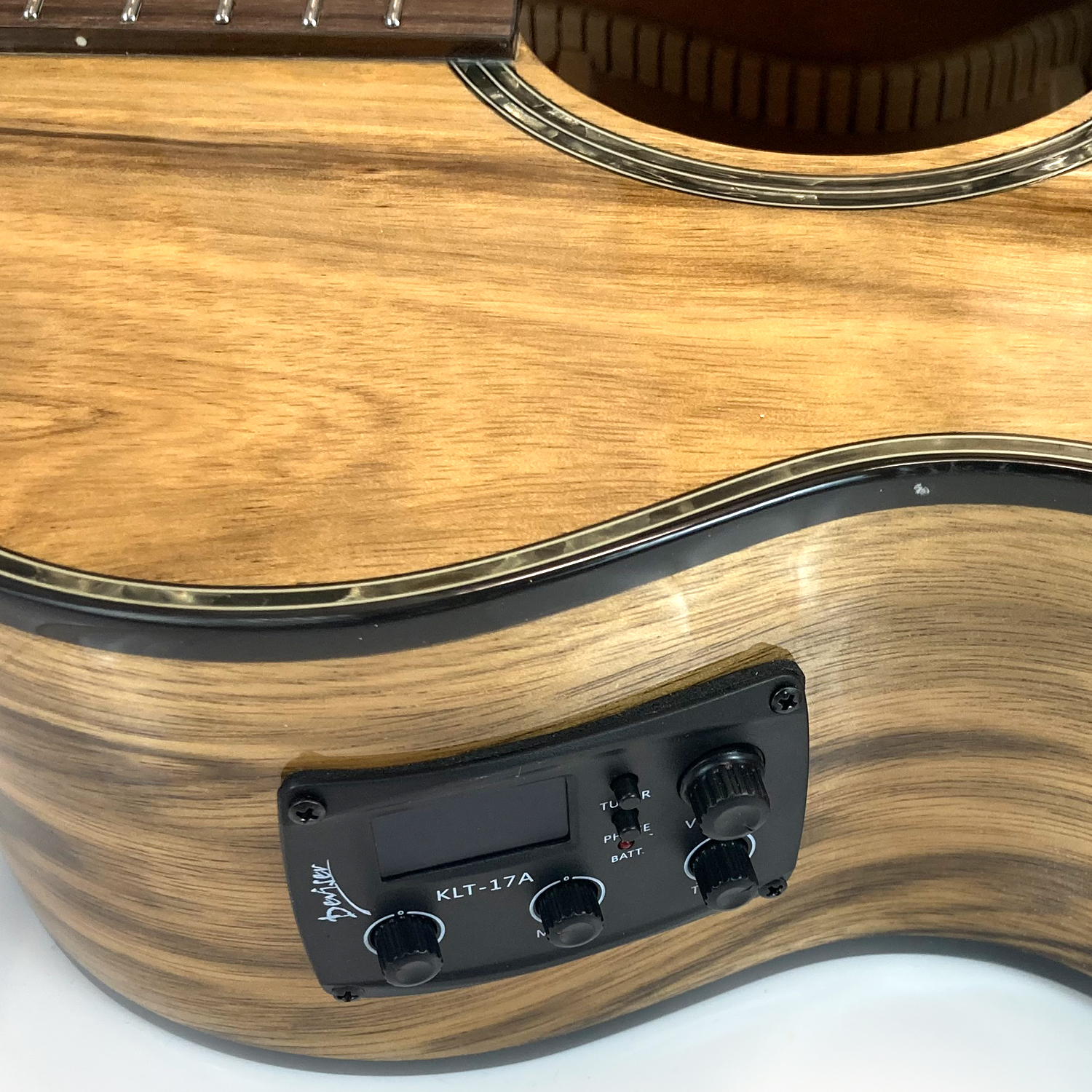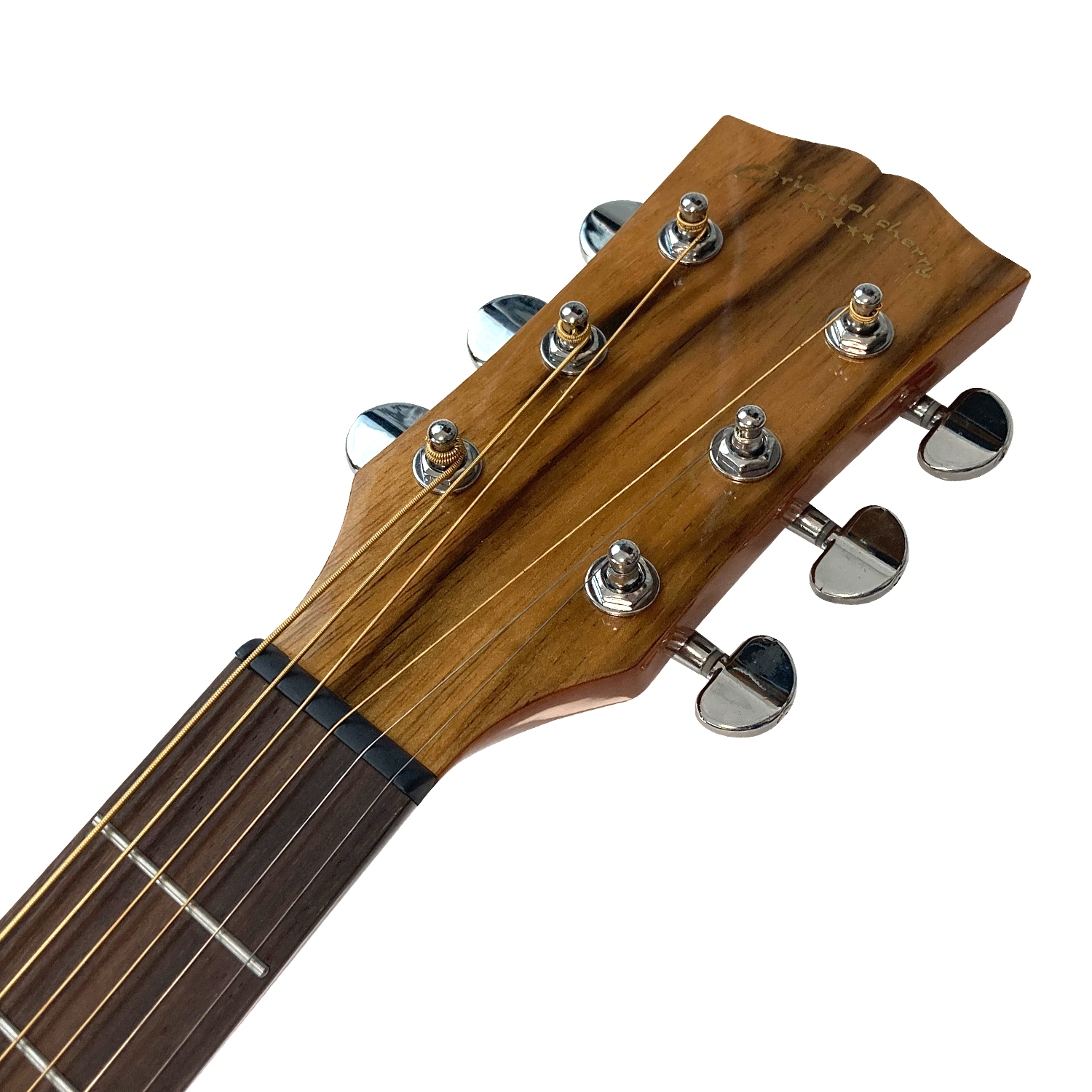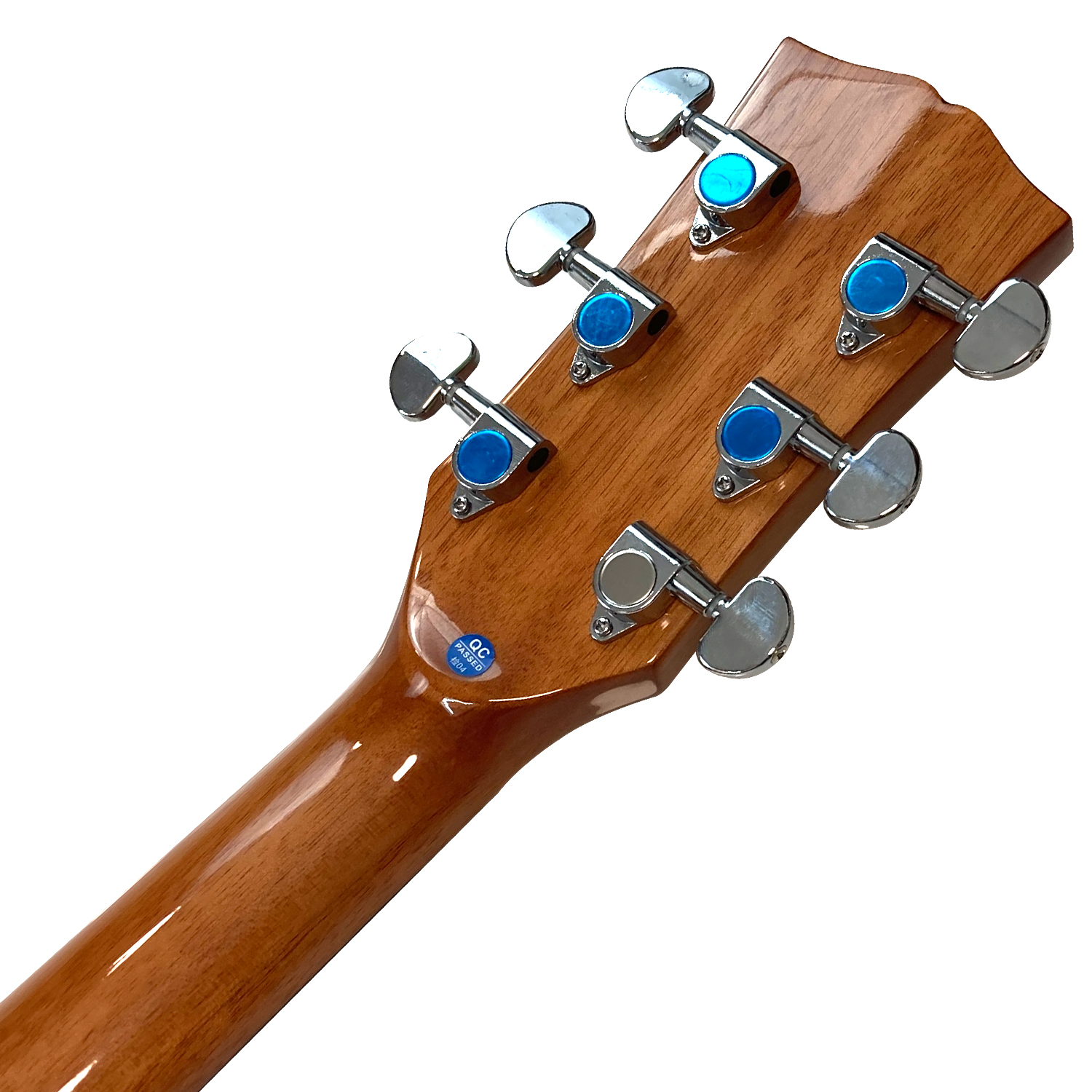 גוף הגיטרה מיוצר מעץ DAO, המספק צליל חם ומאוזן עם הקרנה טובה ותגובה מדויקת לפריטה. צוואר מהגוני תורם ליציבות, לנוחות אחיזה גבוהה ולתחושת נגינה טבעית, גם לאורך זמן. השילוב בין העצים יוצר סאונד ברור ונעים, המתאים לליווי שירה, תרגול יומי ונגינה בהרכב.